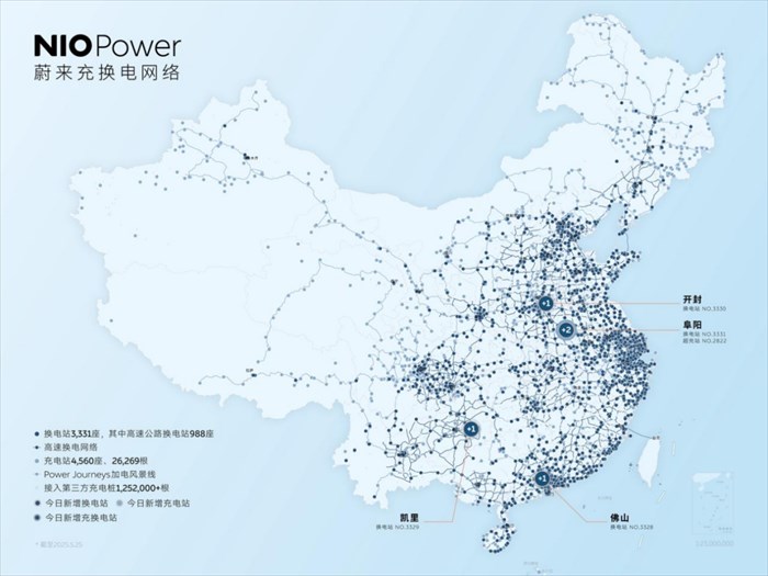 自2018年5月20日第一座换电站投入运营以来,截至2025年5月25日,蔚来在全国范围已累计提供换电服务超过7400万次,换电站累计布局数量已达3,331座,其中高速公路换电站988座,超充站数量达4,560座,充电桩26,269根,接入第三方充电桩1,252,000 根,“电区房”(距离换电站3公里以内的住宅或办公场所)覆盖率达82.2%,为用户提供可充可换可升级的能源服务体验,让加电比加油更方便。