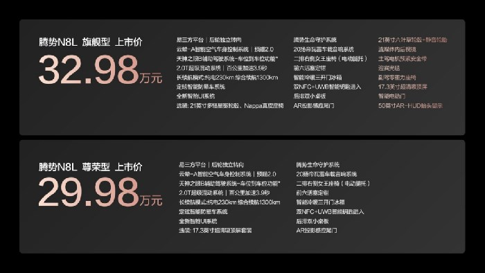 10月28日,“大六座安全豪华SUV”腾势N8L正式上市,共推出2款车型,官方指导价为29.98万元~32.98万元!N8L全系标配“六大核心科技”,以超越传统豪华的品质标准,诠释家用车的豪华感、安全感与科技感,创造让全家人动心、舒心、省心、安心、暖心的出行体验,以“五心体验 三感相伴”,定义美好出行。