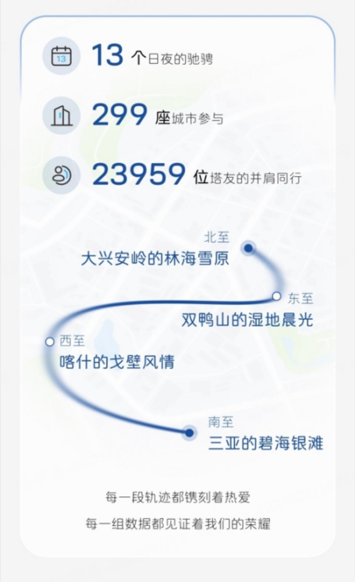 历时13天,299座城市参与,23959位塔友同行,全城好开,全程好用!