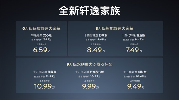 十五代轩逸上市后,与轩逸·经典、十四代轩逸联袂打造全新轩逸家族,满足中国家庭多样化需求。其中,6万买轩逸・经典,品质纯粹,可靠又舒适,安心之选;8万买十四代轩逸,兼顾智能科技与驾乘质感,舒适之选;9万买十五代轩逸,双联屏大沙发双标配,定义智能家轿新高度,智慧之选。对于中国家庭来说“选家轿,必有一款轩逸,适合你!”