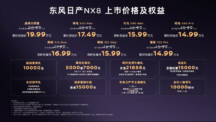 上市权益八重礼同步公布,包括超级置换礼:4月30日前下订直减10000元,叠加优惠后,东风日产NX8上市限时权益价为14.99-17.49万元;限时定购礼:4月12日前支付5000元定金可抵7000元;限时免费升舱礼:免费赠送后排133°电动大躺椅、全遮光电动遮阳帘、墨海蓝外观色;选装礼:零压舒享套装、全景视听套装、时尚光幕套装,限时超低价;以及无忧用车礼、国家置换补贴、东风日产车主复购礼、合伙人推荐礼等。